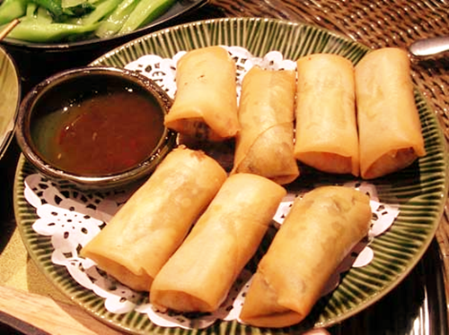 Today, there are numerous types of fillings, including shredded pork with chives, shepherd's purses and sweetened bean paste etc. Spring rolls are ready when they are golden in color and come on top of the oil after being fried. When served, the rolls taste better if dipped in sauces. The snacks are crisp outside and fresh inside, really delicious. Spring rolls vary slightly from place to place, with well-known types being Shanghai Spring Rolls and Fuzhou Spring Rolls.