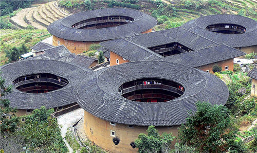 Fujian Tulou is a type of Chinese rural dwellings of the Hakka and Minnan people in the mountainous areas in Fujian. The layout of Fujian Tulou followed the Chinese dwelling tradition of "closed outside, open inside" concept: an enclosure wall with living quarters around the peripheral and a common courtyard at the center. A Tulou is usually a large, enclosed and fortified earth building, most commonly rectangular or circular in configuration, with very thick load-bearing rammed earth walls between three and five stories high and housing up to 100 families.